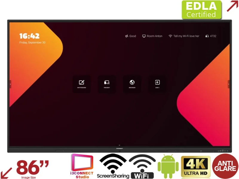 Jopa 86 tuuman interaktiivinen 4K kosketusnäyttö opetukseen ja kokoustiloihin. Google EDLA -sertifioitu Android-alusta mahdollistaa sujuvan yhteistyön, langattoman sisällönjaon ja monipuolisen sovellusten käytön.